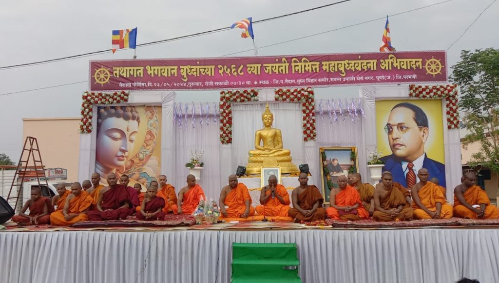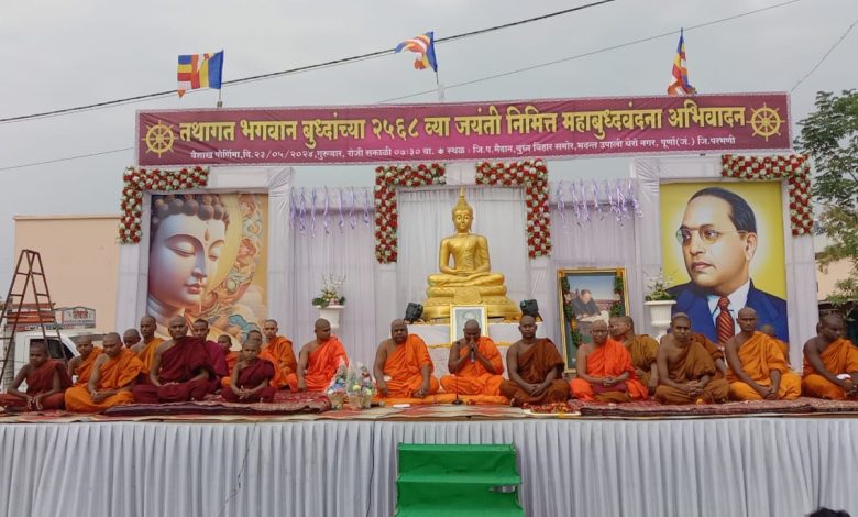 पूर्णा – बुद्ध धम्मामध्ये महाबुद्ध वंदनेची परंपरा आहे बुद्ध धम्माचा प्रचार प्रसारासाठी भिक्खु प्रयत्नशिल आहेत, जगात अनेक मार्ग आहेत परंतू बुद्धाच्या विचारा मार्ग शांती करुणा मैत्री चा सत्याचा मार्ग श्रेष्ठ आहे पेटलेल्या जगाला युद्ध होतात त्याला विझवण्या भगवान बुद्धाचा मार्ग आहे असा धम्म उपदेश भदंत डॉ उपगुप्त महाथेरो पूर्णा यांनी केले. पूर्णा येथे पहिल्यादाच भगवान बुद्धाच्या जयतीच्य निमिताने भीम व बुद्ध जयंती मंडळाच्या वतीने २५६८ व्या जयंती सोहळ्या निमिताने महाबुद्ध वंदनेच्या कार्यक्रमाचे आयोजन जिप माध्यमिक शाळा बुद्ध विहाराच्या प्रांगणात करण्यात आले होते त्या निमिताने बुद्ध विहार येथे धम्म ध्वजाचे ध्वजारोहण भदंत डॉ. उपगुप्त महाथेरो यांच्या हस्ते करण्यात आले . भबुद्ध व डॉ. बाबासाहेब आंबेडकर यांच्या प्रतिमांना भिक्खु संघाच्या वतीने करण्यात आले . त्या नतर महाबुद्ध वंदना करण्यात आली त्या नतर भगवान बुद्धाच्या प्रतिमेची वाद वृंदासह पूर्णा शहराच्या प्रमुख मार्गावरून भव्य मिरवणूक काढण्यात आली. यावेळी धम्म मंचावर भदंत डॉ, उपगुप्त महाथेरो भन्ते पंया बोधी थेरो भन्ते रेवत बोधी जयंती मंडळाचे अध्यक्ष भन्ते बोधीधम्मा भन्ते पंयावंश, श्रामणेर संघासह डॉ. सिद्धार्थ हत्तीअंबीरे , यशवंत उबारे, प्रकाश कांबळे, मधुकर गायकवाड,अशोक कांबळे , अनिल खर्गखराटे, हर्षवर्धन गायकवाड, शामराव जोगदंड, सुनिल मगरे, एम.यु. खंदारे, देवराव खंदारे, मुकूंद भोळे , अनिल खर्गखराटे, ॲड. धम्मा जोंधळे यांच्यासह पोलीस विभागीय अधिकारी डॉ. समाधान पाटील, पोलीस निरिक्षक सुभाष गोबाडे, यांच्या बौद्ध उपासक उपासिका उपस्थित होते डॉ. आंबेडकर चौक येथे डॉ. बाबासाहेब आंबेडकर यांच्या पुतळ्यास पुष्पहार अर्पण करून धम्म ध्वजारोहण भन्ते पंयाबोधी याच्या हस्ते करण्यात आले पुढे उपगुप्त महाथेरो म्हणाले की, भगवान बुद्धाचा मार्ग श्रेष्ठ आहे पंचशिल दहा पारमिता आर्य आष्टागाच आहे बाबा साहेब आंबेडकरांनी चिंतन मनन करून देशात बुद्धाचा मार्ग स्विकारला बुद्ध कल्याणाचा मार्ग आहे त्या मार्गानी आपण चालले पाहिजे आपल्या तील विभार दुर करा सदगुणी सद विचारी बना सन्मार्गाने चला असा धम्म उपदेश दिला. यावेळी भन्ते पंय्याबोधी म्हणाले की पंचशिल हा सुखाचा मार्ग आहे मना मध्ये श्रद्धा महत्वाचे आहे अस्टशिलचे पालन आपण केले पाहिजे बुद्ध धम्मामध्ये वैशाख पौर्णिमेल महत्व आहे असा उपदेश दिला. या कार्यक्रम यशस्वीतेकरिता जयंती मंडळाचे पदाधिकारी साहेबराव सोनवणे, अतूल गवळी, त्र्यंबक कांबळे, अमृत कऱ्हाळे,श्रीकांत हिवाळे सर, सुरज जोंधळे, दिलीप गायकवाड, पी.जी. रणवीर, राम भालेराव,बंटी रणवीर, प्रशांत भालेराव, राहूल धबाले, विजय खं
