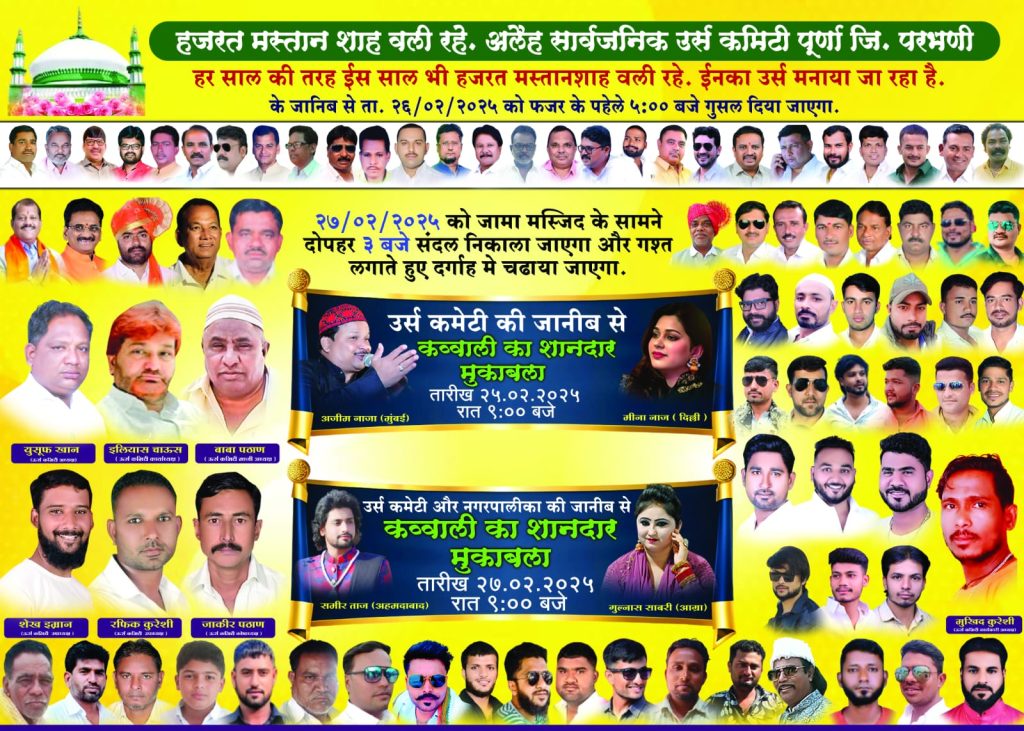 पूर्णा /येथे सुरू असलेल्या हजरतं मस्तान शहावली च्या सार्वजनिक उर्स निमित्त सोमवारी 24 फेब्रुवारी रोजी मुशायारा कार्यक्रमात नामवंत कवी तथा ,शायराना आमंत्रित करण्यात आले आहे या मुशायरा कार्यक्रमाचे आयोजन मुख्यमंत्री एकनाथ शिंदे यांच्या गटाचे पाथरी येथील युवा नेते सईद खान तथा माजी उपनगराध्यक्ष हाजी कुरेशी यांच्या वतीने आयोजन करण्यात आले आहे
