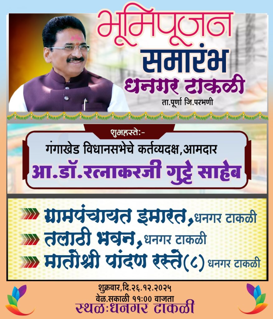 पुर्णा (प्रतिनिधी):पुर्णा तालुक्यातील धनगर टाकळी येथे शुक्रवारी (दि. २६ डिसेंबर) विविध महत्त्वपूर्ण शासकीय विकासकामांचा शुभारंभ करण्यात आला. गंगाखेड विधानसभा मतदारसंघाचे कर्तव्यदक्ष आमदार डॉ. रत्नाकरजी गुट्टे साहेब यांच्या शुभहस्ते या कामांचे भूमिपूजन मोठ्या उत्साहात संपन्न झाले. यावेळी गावकऱ्यांच्या मागणीनुसार गावात शादीखाना उभारण्याची घोषणाही आमदार साहेबांनी केली.या विकासकामांचे झाले भूमिपूजन:गावाच्या सर्वांगीण विकासासाठी आणि ग्रामस्थांच्या सोयीसाठी खालील कामांचे भूमिपूजन करण्यात आले:१. ग्रामपंचायत नवीन इमारत: ग्रामस्थांना प्रशासकीय कामासाठी सुसज्ज अशी नवी वास्तू मिळणार आहे.२. तलाठी भवन: महसूल विभागाचे कामकाज अधिक सुलभ होण्यासाठी स्वतंत्र तलाठी कार्यालयाचे बांधकाम केले जाणार आहे.३. मातोश्री पांदण रस्ते (८ रस्ते): शेतकऱ्यांची शेतात जाण्याची अडचण दूर करण्यासाठी तब्बल ८ पांदण रस्त्यांच्या कामाला सुरुवात करण्यात आली आहे.मुस्लिम समाजाला शब्द, ‘शादीखाना’ देणार!कार्यक्रमादरम्यान धनगर टाकळी येथील मुस्लिम समाज बांधवांनी आपली अडचण मांडताना सांगितले की, गावात लग्नकार्यासाठी किंवा सामाजिक कार्यक्रमांसाठी ‘शादीखाना’ उपलब्ध नाही. या मागणीची तात्काळ दखल घेत आमदार डॉ. रत्नाकर गुट्टे यांनी “मी तुम्हाला शब्द देतो, गावात शादीखाना मी देणार,” असे आश्वासन दिले. त्यांच्या या घोषणेमुळे मुस्लिम बांधवांमध्ये आनंदाचे वातावरण पसरले असून सर्वांनी आमदार साहेबांचे आभार मानले.लोकप्रतिनिधींचे मार्गदर्शन:यावेळी बोलताना आ. डॉ. रत्नाकर गुट्टे म्हणाले की, “ग्रामीण भागाचा विकास हाच आमचा मुख्य ध्यास आहे. धनगर टाकळी आणि परिसरातील प्रत्येक समाजाला उत्तम सोयीसुविधा मिळाव्यात यासाठी आम्ही कटिबद्ध आहोत. नवीन ग्रामपंचायत आणि तलाठी भवनामुळे शासकीय कामात पारदर्शकता येईल, तर पांदण रस्त्यांमुळे बळीराजाची मोठी सोय होईल.”उपस्थिती:या सोहळ्यासाठी धनगर टाकळी येथील सरपंच, उपसरपंच, ग्रामपंचायत सदस्य, विविध संस्थांचे पदाधिकारी, शासकीय अधिकारी आणि मोठ्या संख्येने ग्रामस्थ उपस्थित होते. हा कार्यक्रम शुक्रवारी सकाळी ११:०० वाजता उत्साहात पार पडला.