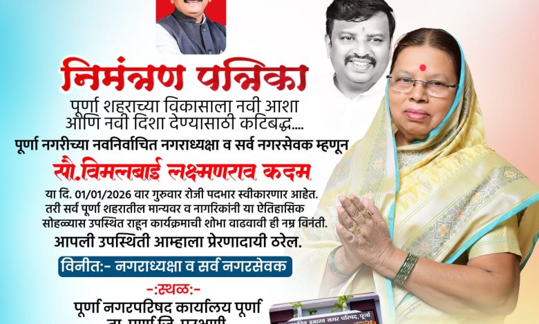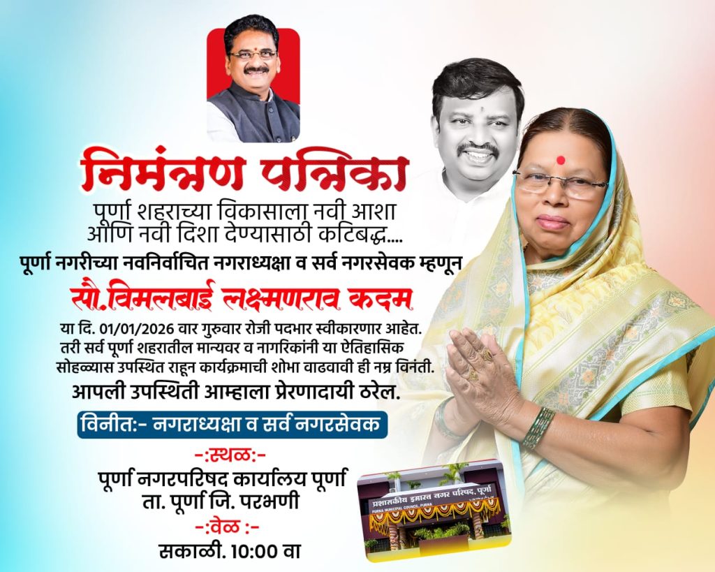 पूर्णा (प्रतिनिधी):नूतन वर्षाच्या पहिल्याच दिवशी पूर्णा शहराच्या सर्वांगीण विकासाचा संकल्प सोडत, नवनिर्वाचित नगराध्यक्षा सौ. विमलबाई लक्ष्मणराव कदम या उद्या गुरुवार, १ जानेवारी २०२६ रोजी आपल्या पदाचा अधिकृत पदभार स्वीकारणार आहेत.शहराला विकासाची नवी दिशा देण्यासाठी आणि जनसामान्यांचे प्रश्न मार्गी लावण्यासाठी आपण कटिबद्ध असल्याचे विमलबाई कदम यांनी यावेळी सूचित केले. या ऐतिहासिक सोहळ्यासाठी पूर्णानगरपरिषद प्रशासन आणि नवनिर्वाचित नगरसेवक सज्ज झाले आहेत.कार्यक्रमाची रुपरेषा स्थळ: नगरपरिषद कार्यालय, पूर्णा. (जि. परभणी) वेळ: सकाळी ठीक १०:०० वाजता. प्रमुख उपस्थिती सर्व नवनिर्वाचित नगरसेवक, शहरातील मान्यवर आणि नागरिक.नवनिर्वाचित नगराध्यक्षांच्या पदग्रहण सोहळ्यानिमित्त शहरात उत्साहाचे वातावरण असून, हा सोहळा पूर्णानगरीच्या विकासाला नवी गती देणारा ठरेल,असा विश्वास नागरिकांकडून व्यक्त होत आहे. नवनिर्वाचित नगराध्यक्षा व सर्व नगरसेवकांनी या सोहळ्यास शहरवासीयांना मोठ्या संख्येने उपस्थित राहण्याचे आवाहन केले आहे.