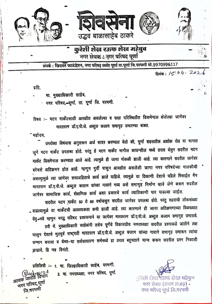 पूर्णा (ता. प्रतिनिधी): येथील अशोक रोड भागातील जुन्या मटन मार्केटची जागा सध्या रिक्त असून, या मोकळ्या जागेवर भारतरत्न डॉ. ए.पी.जे. अब्दुल कलाम यांच्या नावाने भव्य बहुउद्देशीय सभागृह उभारण्यात यावे, अशी मागणी नगरसेवक कुरेशी शेख रऊफ शेख महेबूब यांनी मुख्याधिकाऱ्यांकडे निवेदनाद्वारे मागणी केली आहे.शहरातील अशोक रोड परिसरात गेल्या ५० ते ६० वर्षांपासून मटन मार्केट कार्यरत होते. मात्र, नगर परिषदेने ठराव घेऊन सदर मार्केटचे बांधकाम पाडले आहे. सध्या ही जागा पूर्णपणे मोकळी असल्याने तिथे मोठ्या प्रमाणावर अतिक्रमणे वाढण्याची भीती निर्माण झाली आहे. ही जागा नगर परिषदेच्या मालकीची असल्याने तिचा उपयोग समाजहिताच्या कामासाठी व्हावा, अशी मागणी जोर धरत आहे.शैक्षणिक व सामाजिक कार्याला मिळणार चालना:देशाचे माजी राष्ट्रपती आणि थोर शास्त्रज्ञ डॉ. ए.पी.जे. अब्दुल कलाम यांच्या नावाने या ठिकाणी सभागृह उभारल्यास, शहरात सामाजिक व शैक्षणिक उपक्रमांना मोठी मदत होईल. या सभागृहामुळे सर्वसामान्य नागरिकांना विविध कार्यक्रमांसाठी हक्काची जागा उपलब्ध होईल, असेही निवेदनात नमूद करण्यात आले आहे.ठराव मंजूर करण्याची विनंती:वाढत्या लोकसंख्येचा विचार करता शहरात अशा सार्वजनिक सभागृहाची अत्यंत गरज आहे. त्यामुळे मुख्याधिकारी व नगराध्यक्षांनी या विषयात जातीने लक्ष घालून येणाऱ्या सर्वसाधारण सभेत या प्रस्तावाचा ठराव बहुमताने मंजूर करावा व हा प्रश्न मार्गी लावावा, अशी विनम्र विनंती कुरेशी शेख रऊफ यांनी केली आहे. या निवेदनाच्या प्रती जिल्हाधिकारी परभणी व नगराध्यक्षांनाही सादर करण्यात आल्या आहेत.